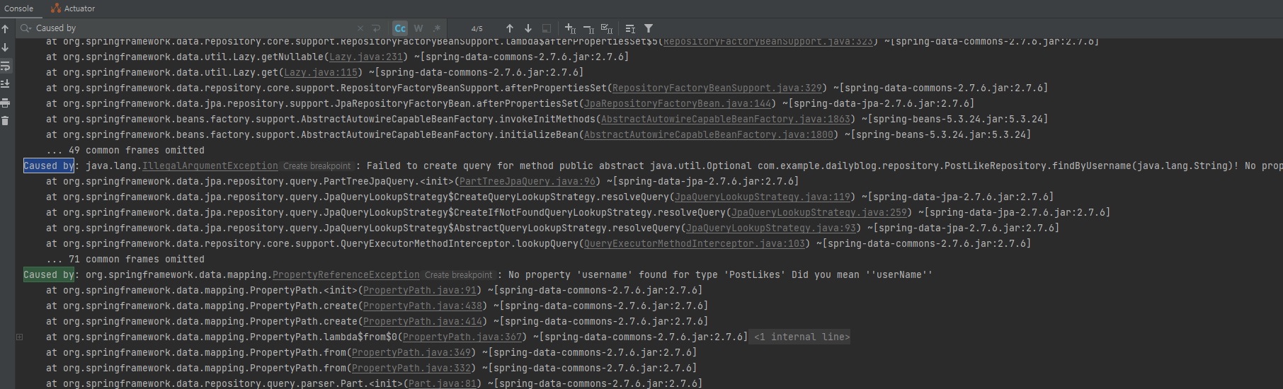 org.springframework.beans.factory.UnsatisfiedDependencyException: Error creating bean with name 'likeController' defined in file [C:\Users\user\Documents\Sparta-codingClub\spartaCamp\myblog\dailyblog\build\classes\java\main\com\example\dailyblog\controller\LikeController.class]: Unsatisfied dependency expressed through constructor parameter 0; nested exception is org.springframework.beans.factory.UnsatisfiedDependencyException: Error creating bean with name 'likeService' defined in file [C:\Users\user\Documents\Sparta-codingClub\spartaCamp\myblog\dailyblog\build\classes\java\main\com\example\dailyblog\service\LikeService.class]: Unsatisfied dependency expressed through constructor parameter 0; nested exception is org.springframework.beans.factory.BeanCreationException: Error creating bean with name 'postLikeRepository' defined in com.example.dailyblog.repository.PostLikeRepository defined in @EnableJpaRepositories declared on JpaRepositoriesRegistrar.EnableJpaRepositoriesConfiguration: Invocation of init method failed; nested exception is org.springframework.data.repository.query.QueryCreationException: Could not create query for public abstract java.util.Optional com.example.dailyblog.repository.PostLikeRepository.findByUsername(java.lang.String); Reason: Failed to create query for method public abstract java.util.Optional com.example.dailyblog.repository.PostLikeRepository.findByUsername(java.lang.String)! No property 'username' found for type 'PostLikes' Did you mean ''userName''; nested exception is java.lang.IllegalArgumentException: Failed to create query for method public abstract java.util.Optional com.example.dailyblog.repository.PostLikeRepository.findByUsername(java.lang.String)! No property 'username' found for type 'PostLikes' Did you mean ''userName''